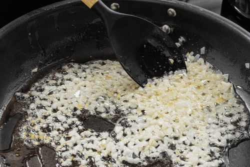 В большой сковороде разогреть растительное и сливочное масло (40 г), обжарить лук до золотистого цвета.