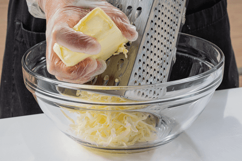 Охлажденное несоленое масло натереть на крупной терке и переложить в большую миску.