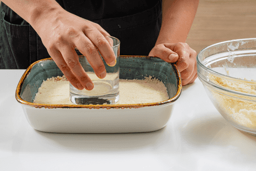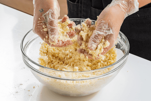 К маслу добавить просеянную муку с разрыхлителем и соль (1/4 чайной ложки).