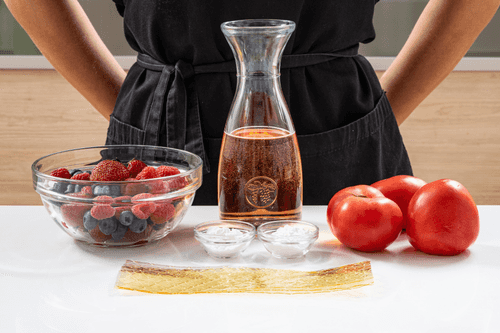 Десерт со вкусом лета в буквальном, а не переносном смысле: спелые томаты, ягоды, розовое вино, все атрибуты отпускного dolce far niente встречаются в одном блюде. Тут важно сохранить тонкую грань, чтобы желе не получилось слишком пресным. Поэтому, прежде чем добавлять желатин, обязательно попробуйте то, что получилось, и учтите, что желатин заметно приглушает вкус, поэтому сахара должно быть чуть больше чем достаточно. В том, что между помидорами и садовыми ягодами возникнет вкусовое единство, нет ничего удивительного: в спелом помидоре гораздо больше от сладкого фрукта, чем от овоща, да и с ботанической точки зрения он все-таки ягода.