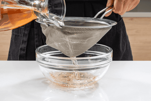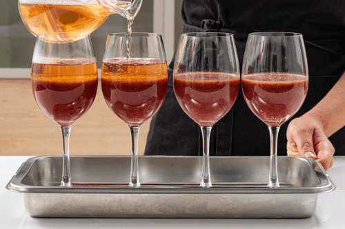 Подогреть оставшийся желатин в сотейнике на слабом огне (он должен слегка растопиться), добавить его в вино, перемешать. Пропустить смесь через сито, чтобы наверняка избавиться от комочков.