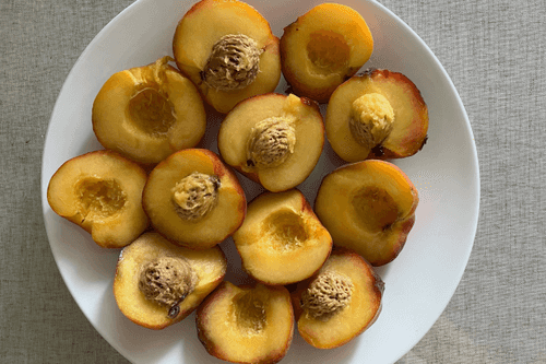 Персики помыть и нарезать пополам.