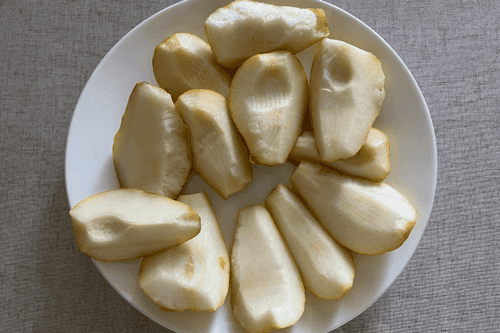 Косточки удалить и нарезать мякоть тонкими дольками.