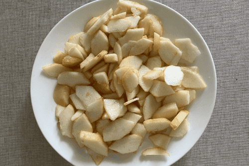 Нарезать груши на тонкие дольки.