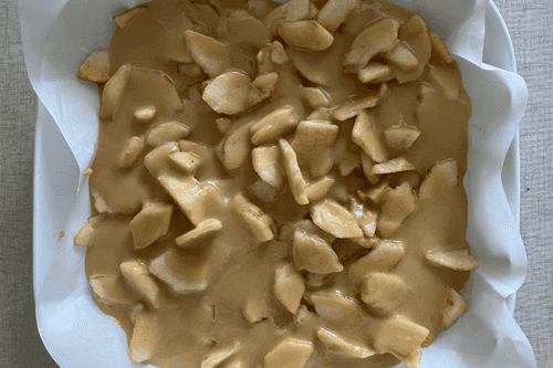 Форму для выпечки застелить пергаментом, выложить немного теста и на него выложить груши.