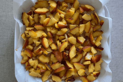 Закрыть груши тестом и сверху выложить персики.