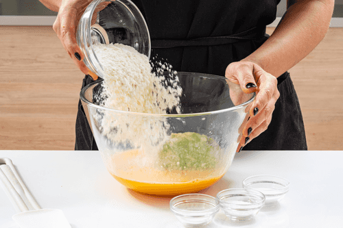 В большой миске слегка взбить яйца. Добавить к яйцам кабачки, муку, сахар, соль и разрыхлитель. Перемешать. Тесто должно быть полугустым, чуть гуще блинного.