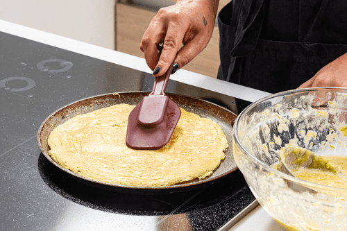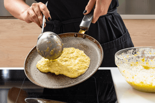 Вылить немного теста на сковороду и распределить его равномерно по дну. Обжарить, пока тесто на донышке не схватится.