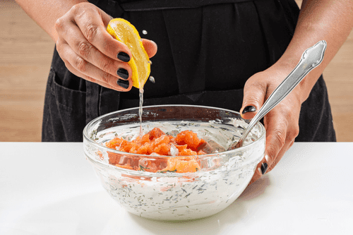Смешать сметану с творожным сыром, укропом, чесноком и лимонным соком. Добавить рыбу и перемешать еще раз.