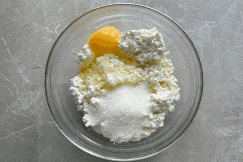 К творогу добавить 1 яйцо, сахар.