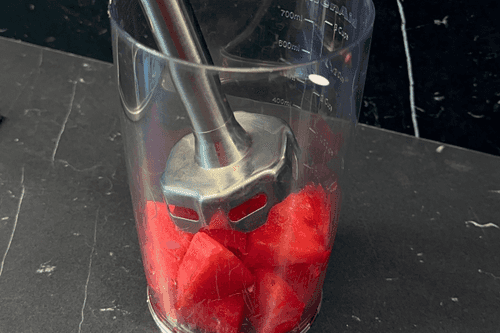 Подготовить все ингредиенты. В миске соединить ряженку, яйцо, разрыхлитель, муку. Арбуз пробить блендером.