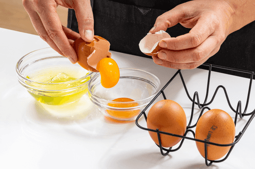 У яиц отделить белки от желтков. Для панкейков понадобится 4 белка и 2 желтка (из остальных желтков можно приготовить соус саварен, с которым потом панкейки — подать).