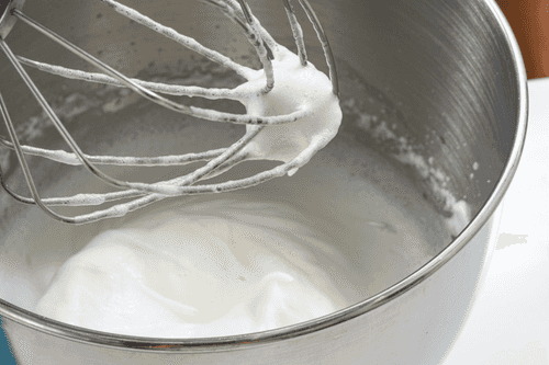 Начать взбивать белки миксером и довести до состояния, когда следы от венчика не будут пропадать.
