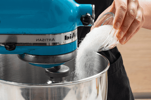 Начать по ложке добавлять сахар, продолжая взбивать белковую массу. Довести белки до состояния, когда они станут гладкими, блестящими и плотными (до жестких пиков), а сахар полностью растворится.