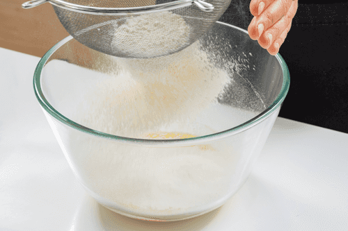 В отдельную миску выложить яичные желтки, добавить растопленное охлажденное сливочное масло и молоко. Просеять в смесь муку с разрыхлителем. Быстро перемешать венчиком до однородности (не взбивать!).