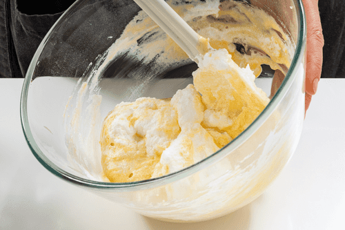 Добавить в получившееся тесто половины взбитых белков, перемешать при помощи лопатки. Ввести остальные белки, очень аккуратно перемешивая, чтобы сохранить объем.