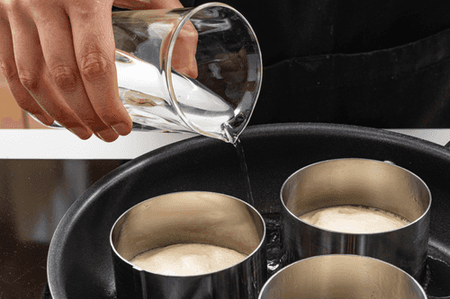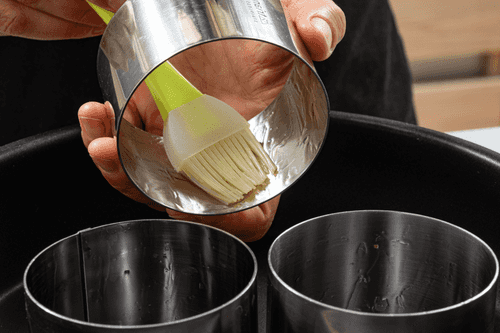 Кольца для выпечки смазать изнутри растительным маслом и поставить в широкую глубокую сковороду, смазанную растопленным сливочным маслом.