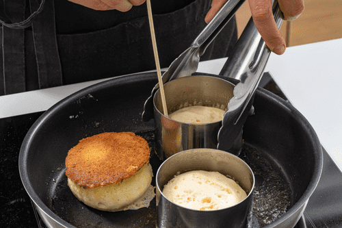 Снять крышку, аккуратно освободить панкейки из колец и перевернуть. Снова накрыть сковороду крышкой (если вода испарилась, долить еще немного). Оставить сковороду на огне еще на 5 минут.