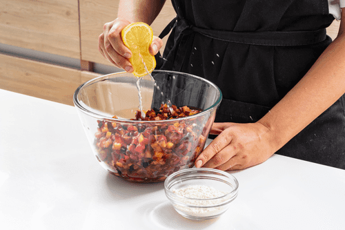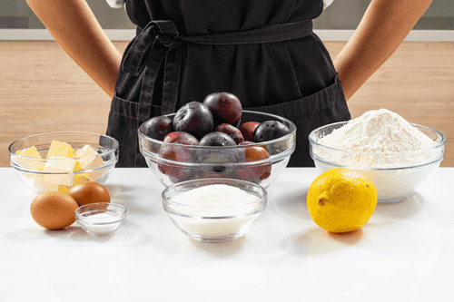 Смешать сливы с сахаром, лимонным соком и оставшейся мукой.