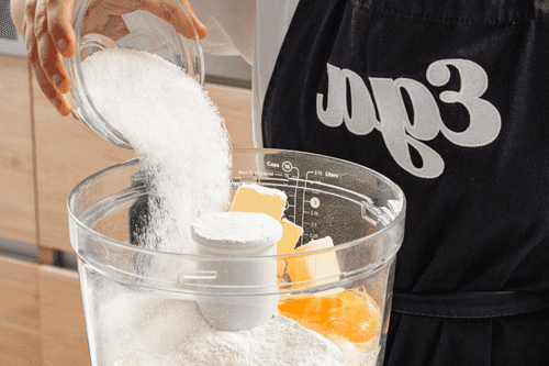 В кухонный комбайн положить масло, добавить 200 грамм сахара, 600 грамм муки, яйца, разрыхлитель и соль.