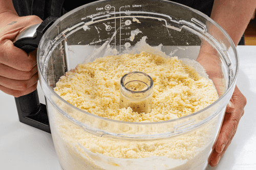 Включить комбайн и мешать до тех пор, пока не получится крошка. Убрать ее в холодильник, пока готовится начинка.