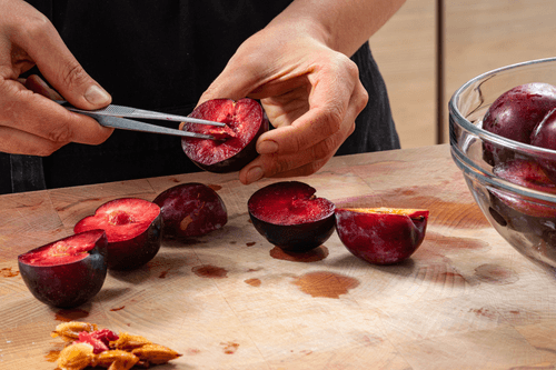 Сливы разрезать пополам и удалить косточки.