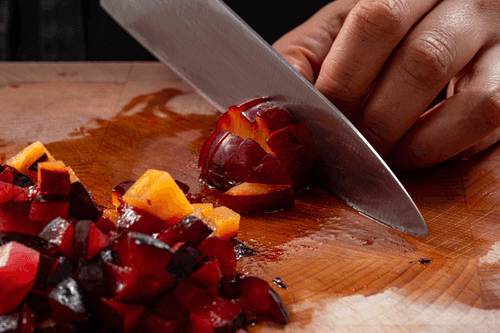 Нарезать сливы мелкими кубиками.