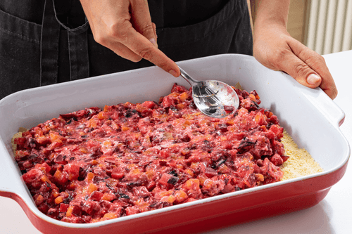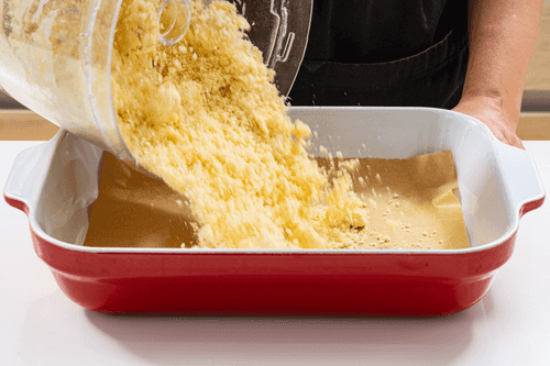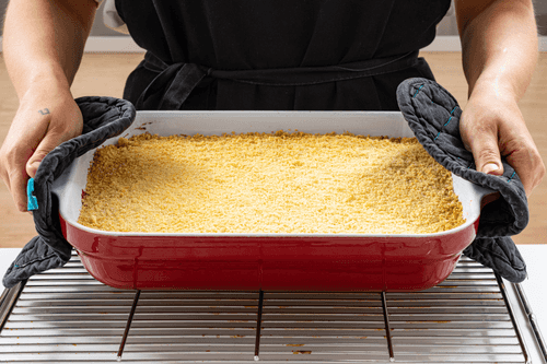 Сверху распределить оставшуюся крошку и отправить в духовку на 40 минут или до золотистого цвета.
