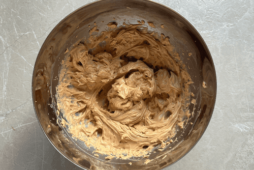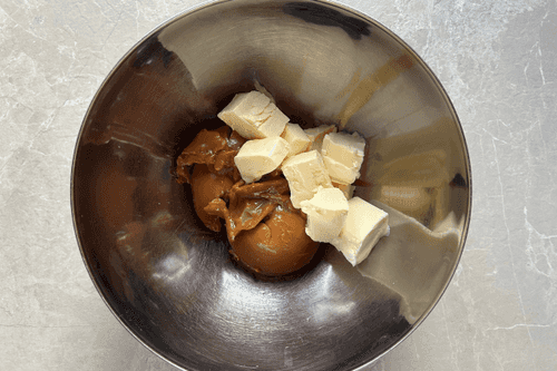 Для крема в миску отправить мягкое сливочное масло, сгущенку и коньяк.