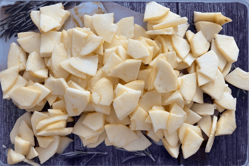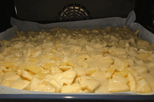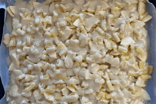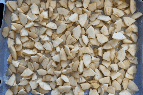 Выложить половину теста и яблоки на застеленный пергаментом противень.