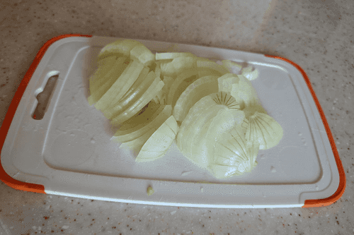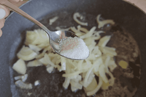 Переложить лук, присыпать сахаром и обжарить до золотистого цвета.