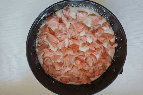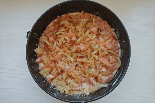 Залить оставшимся тестом и убрать в разогретую духовку при температуре 190 градусов. Выпекать 40 минут до образования румяной корочки.