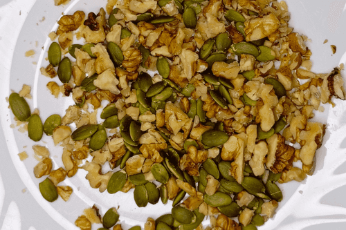 Грецкие орехи мелко порубить, смешать с тыквенными семечками.
