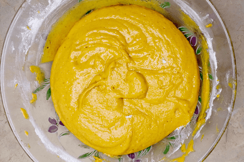 Добавить мучную смесь, быстро перемешать миксером на низких оборотах, чтобы не было комочков.