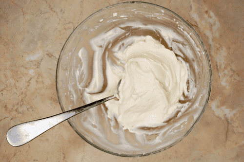 Сливочный сыр смешать с просеянной сахарной пудрой, ванильным сахаром, 2 чайными ложками лимонного сока, взбить крем миксером.