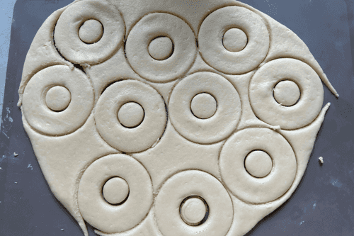 Раскатать тесто толщиной 5–6 мм и вырезать с помощью формы разного размера колечки.