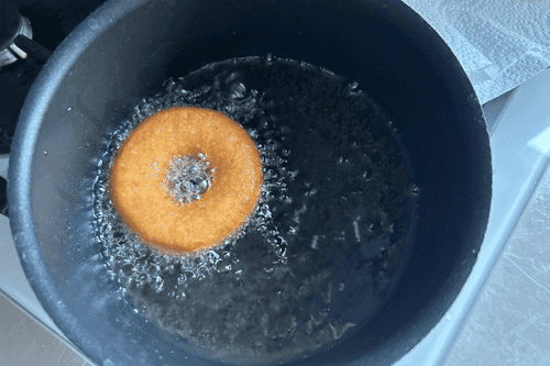 Обжаривать пончики на среднем огне по 2 минуты с каждой стороны. Дать остыть на бумажном полотенце.