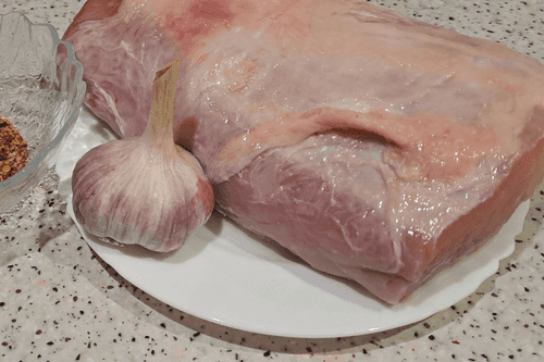 Подготовленное мясо натереть чесноком и посыпать подготовленными приправами с солью.