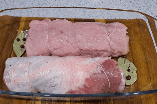 Свернуть мясо в рулет. Закрепить плотной ниткой, чтобы при запекании рулет не развернулся. Выложить в форму для запекания. Добавить 50 мл чистой воды и выложить на дно лавровый лист и душистый перец. Оставить мариноваться на 30 минут при комнатной температуре.