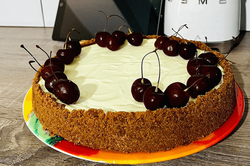 Остывшую основу из печенья залить сырной массой и распределить ее ровно лопаточкой. В духовке эта масса еще немного выровняется.