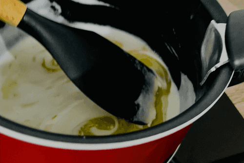 Затем в сырно-яичную массу влить сливки. Так же аккуратно соединить все венчиком.