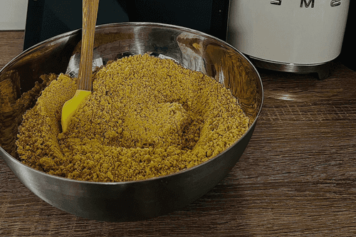 Залить крошку печенья маслом, хорошо перемешать и разровнять силиконовой лопаткой.