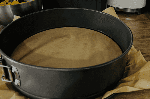 На дно формы выложить бумагу для выпечки, бумагу взять такого размера, чтобы после закрытия формы концы бумаги торчали из нее свободно. Это поможет аккуратно вынуть из формы готовый чизкейк.