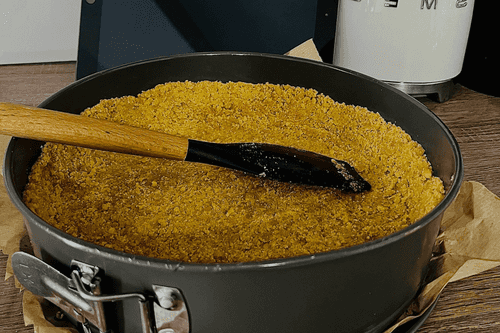 Выложить печенье в форму, разровнять и создать форму для будущего чизкейка. Можно разровнять руками, так удобнее, высота бортиков будет зависеть от диаметра формы для выпечки и от толщины массы из печенья.
