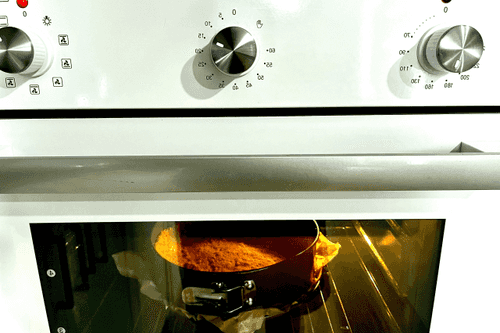 Поставить форму с чизкейком на 120 минут (110 градусов). Не открывать духовку до конца этих 120 минут. Если чизкейк раздувается, снизить чуть температуру, спустя 2 часа выключить духовку, сделать в ней щель (например, просунув прихватку) и оставить до полного остывания духовки и чизкейка. Остывший чизкейк достать из духовки, вынуть из формы.