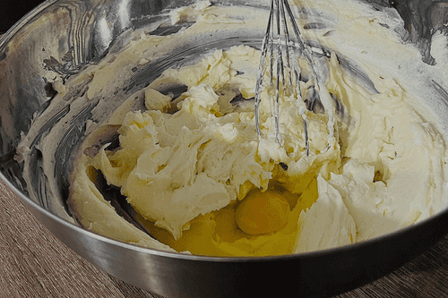 Яйца добавить по одному и после каждого добавленного яйца хорошо перемешивать, ни в коем случае не взбивать массу, а аккуратно медленно соединять, избегая появления пузырей воздуха.