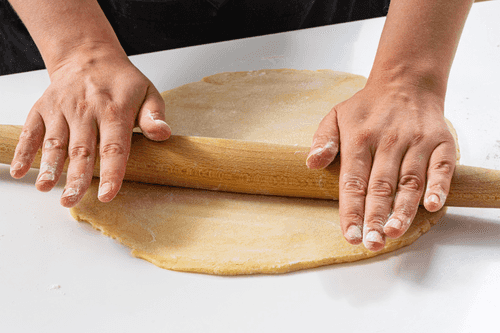 Отдохнувшее тесто раскатать на поверхности, припыленной мукой. Толщина получившегося пласта должна быть 5–7 мм.