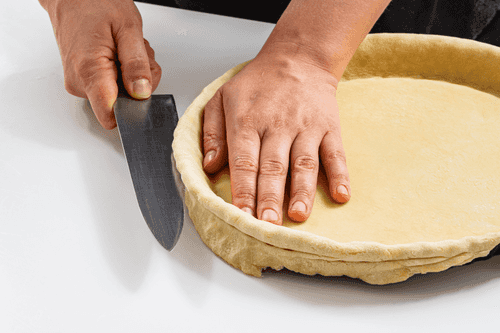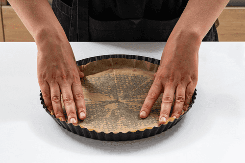 Выложить тесто в форму. Излишки теста удалить ножом так, чтобы остался небольшой бортик.