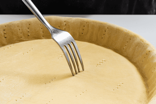 Вилкой наколоть тесто по всей поверхности, чтобы оно не поднималось при выпекании.