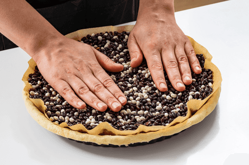 На заготовку теста постелить еще один лист пергамента и высыпать на него сухую фасоль (или специальные керамические бобы для выпечки). Отправить в духовку при 180 градусах на 15–20 минут. С готового коржа снять груз и остудить на решетке.
